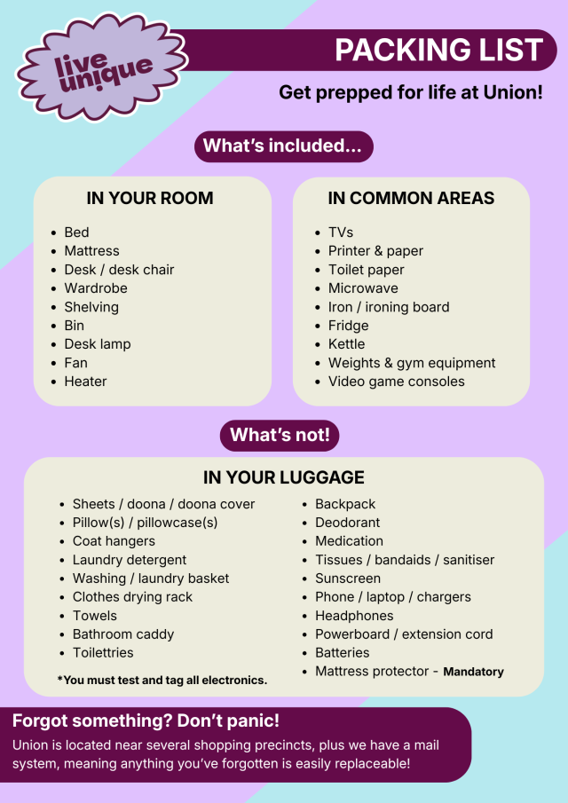 New to Union College in 2026? Here's what you need to pack. Important Dates For 2026 Check in day for new residents – Sunday 15 FebruaryOrientation Week for new residents – Monday 16 February – Saturday 21 FebruaryCheck in day for returning residents – Sunday 22 FebruaryUQ Semester 1 classes – Monday 23 February – Friday 29 MayUQ SWOT VAC | Semester 1 – Monday 1 June – Friday 5 JuneUQ Exam Period | Semester 1 – Saturday 6 June – Saturday 20 JuneUQ Semester 2 classes – Monday 27 July – Friday 30 OctoberUQ SWOT VAC | Semester 2– Monday 2 November – Friday 6 NovemberUQ Exam Period | Semester 2 – Saturday 7 November – Saturday 21 November* dates are subject to change 2026 University Academic Calendars Australian Catholic University Academic Calendar 2026Griffith University Academic Calendar 2026CQ Academic Calendar 2026 UQ Academic Calendar 2026QUT Academic Calendar 2026CQU Academic Calendar 2026 Your UQ Sport Gold Membership As a Union College Resident, you receive complimentary UQ SPORT GOLD MEMBERSHIP. Inclusions Access to a three-level- weights gymUse of cardio exercise machinesComplimentary 45 minute fitness consultation every 6 weeksAccess to small group fitness training sessionsAccess to group fitness classesAccess to swim fit classes Heated swimming pool accessUnlimited aquatic equipment hiresOff-peak tennis and pickleball court hireAccess to the athletics track*Access to athletics equipment * UQ SPORT Conditions apply FOR MORE INFORMATION ON UQ SPORT MEMBERSHIPS